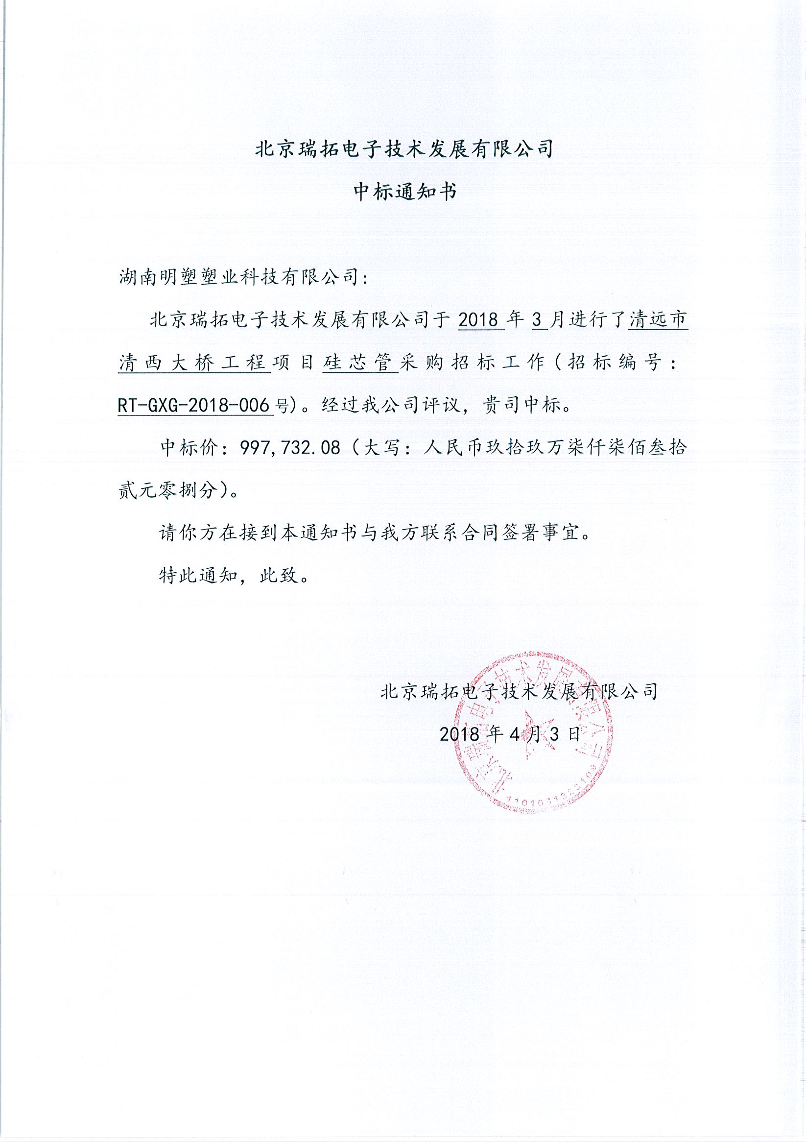 沿印松機(jī)電項(xiàng)目硅芯管中標(biāo)通知單